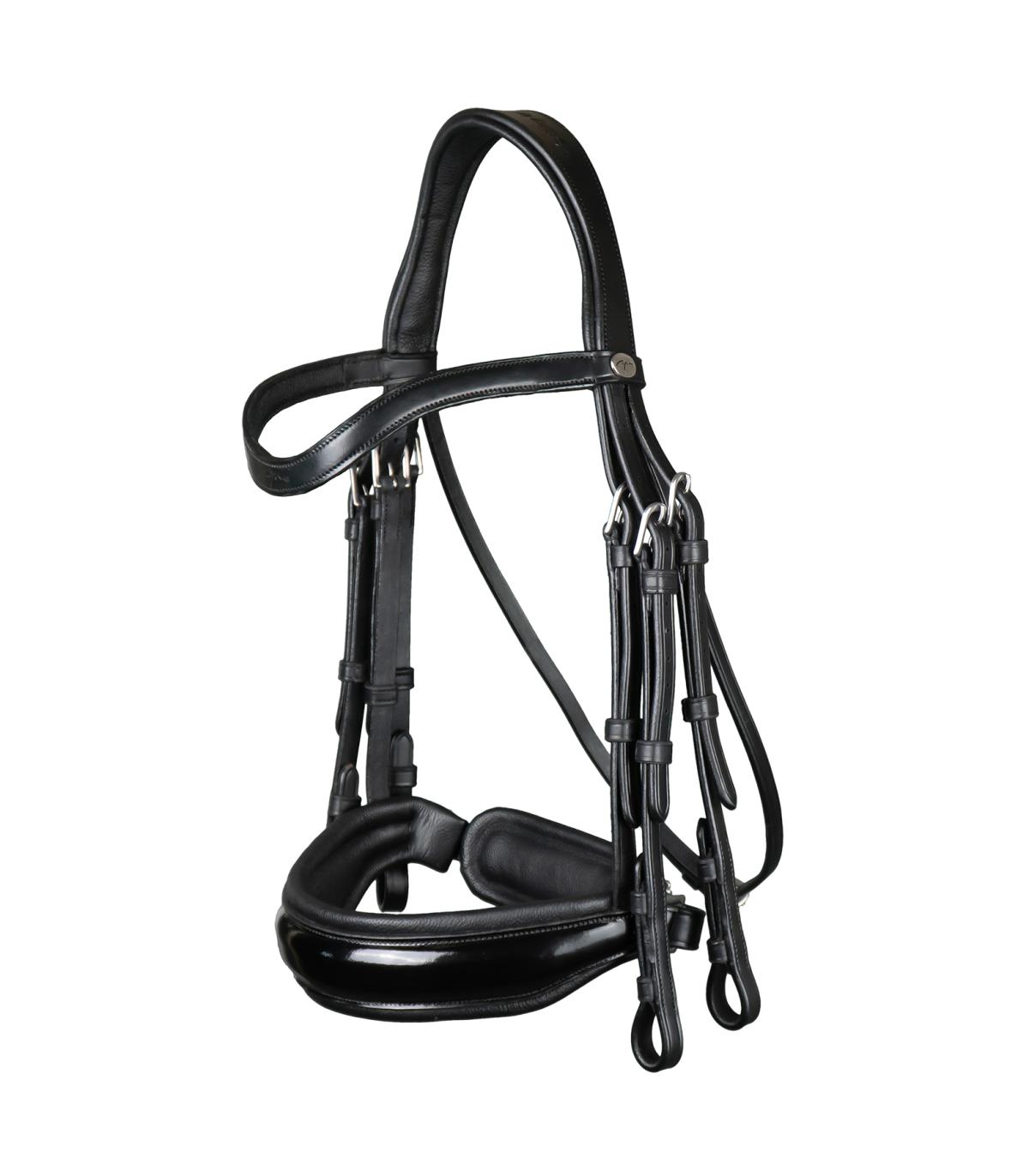 Cette bride avec muserolle large et vernie noir de la Working Collection de chez Dy'on est fabriquée avec le meilleur cuir de buffle.