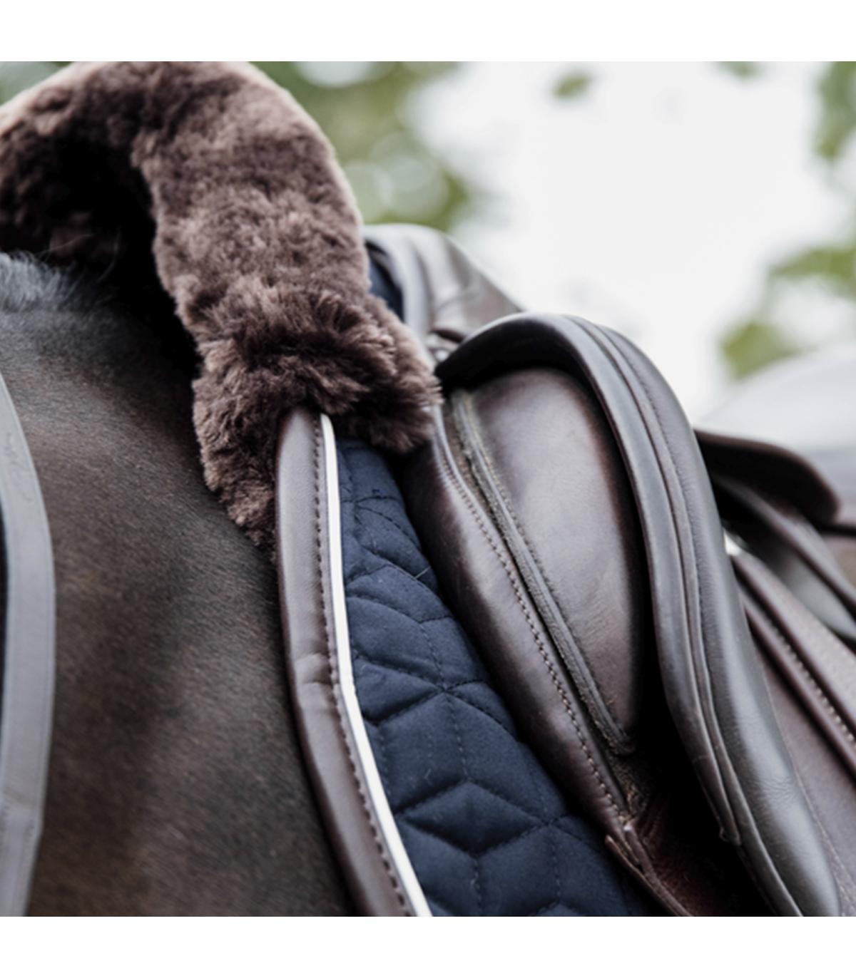 La peau de mouton artificielle à l'intérieur du tapis et sur le garrot offre beaucoup de confort au cheval et abrobe les chocs.